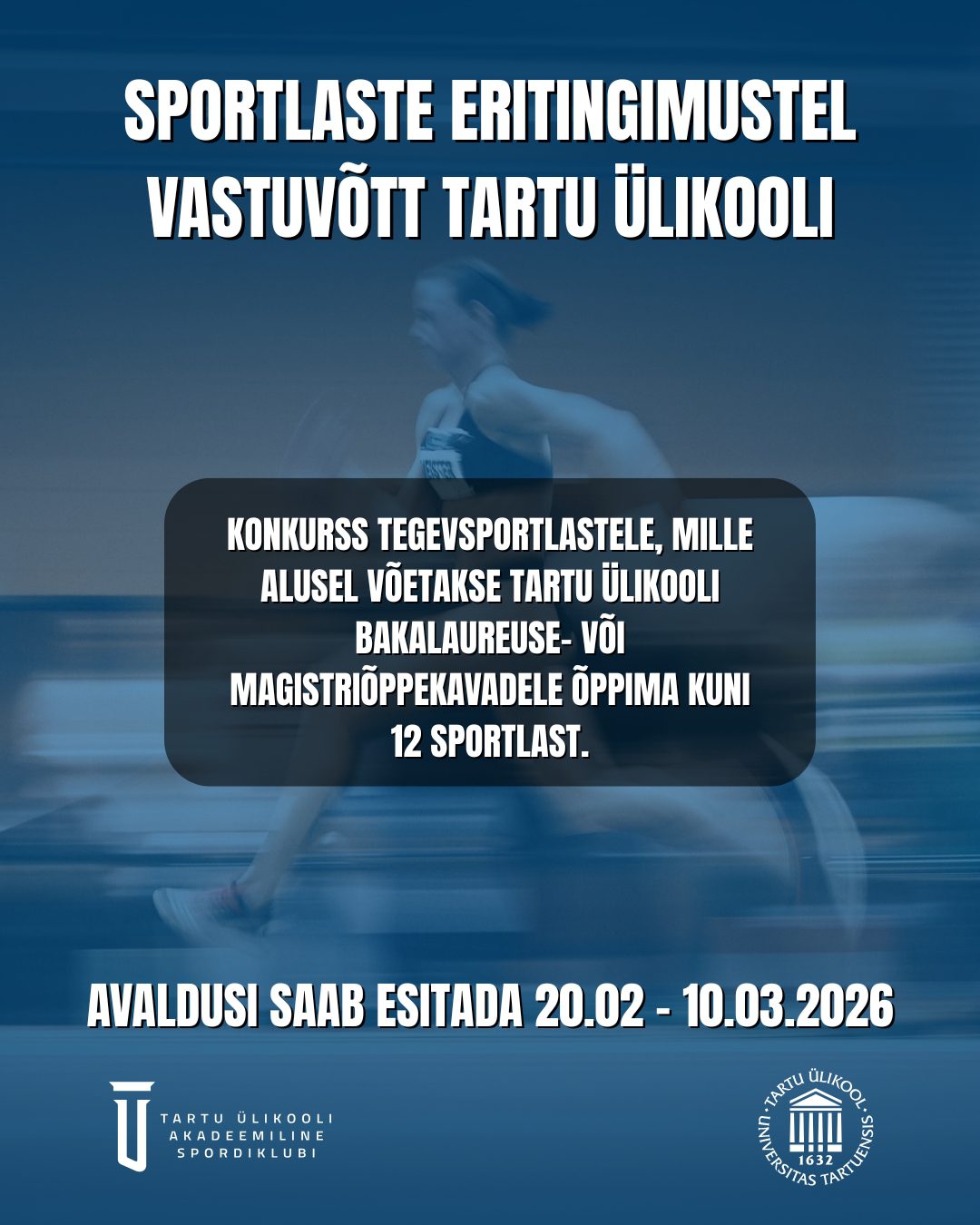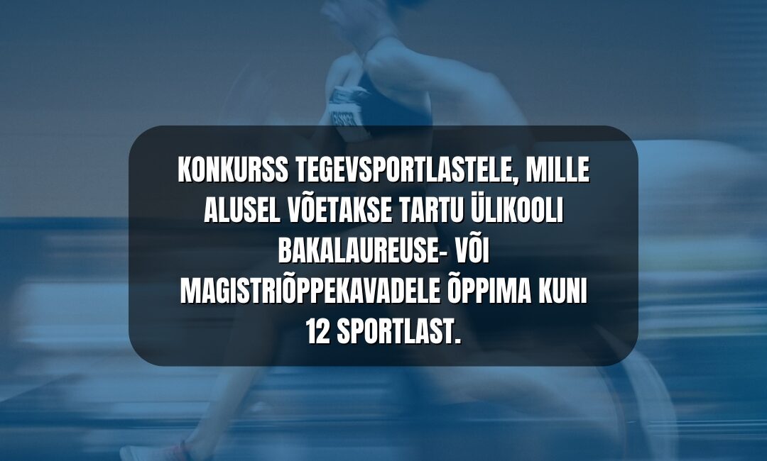 Tartu Ülikooli Akadeemiline Spordiklubi korraldab konkursi, mille kaudu võetakse 2026. aastal eritingimusel õppima kuni 12 rahvusvahelisel tasemel või selle potentsiaaliga tegevsportlast.
