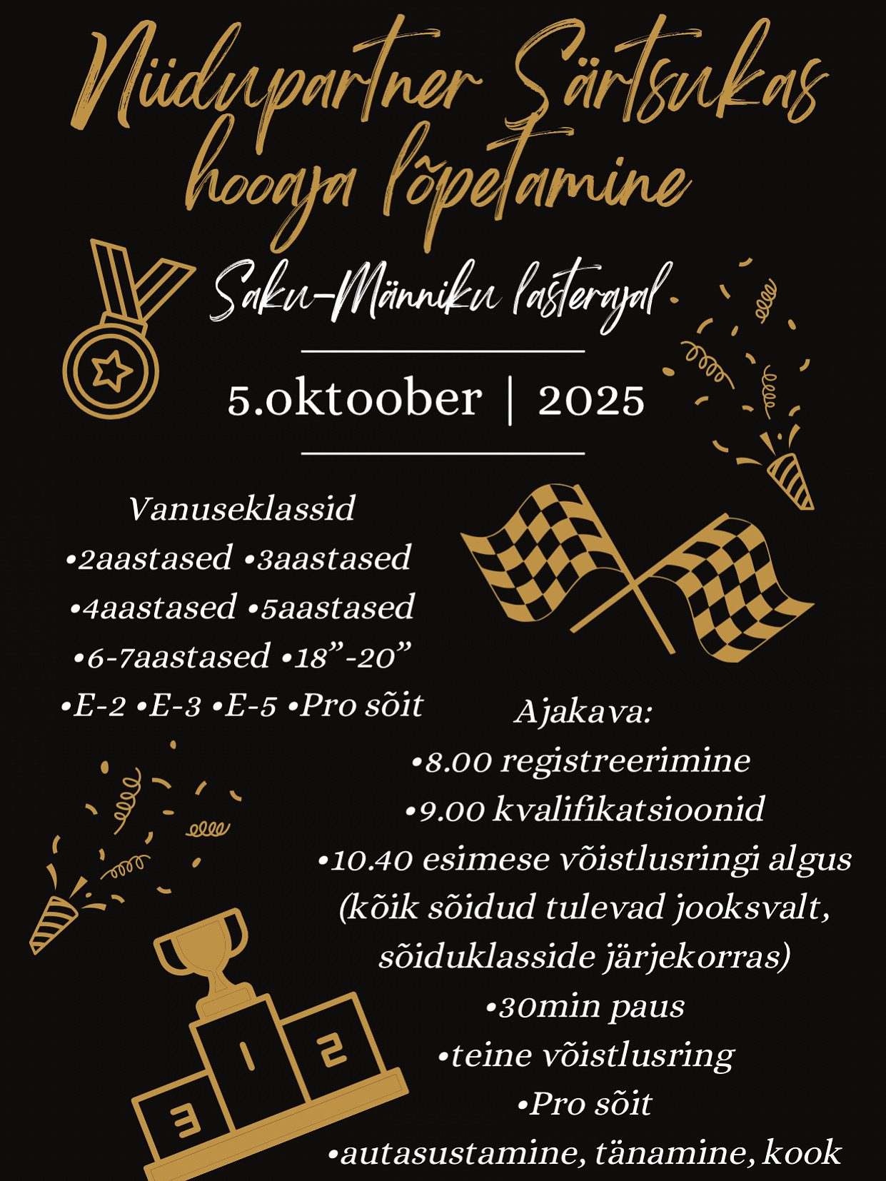 Särtsuka hooaja viimane etapp koos hooaja lõpetamisega toimub 5ndal oktoobril Saku-Männiku krossirajal lasterajal. Hooajal on läbi käinud üle kahesaja väga tubli lapse, keda ootame kindlasti ka viimasel etapil starti. Tulemas põnev võistluspäev:)